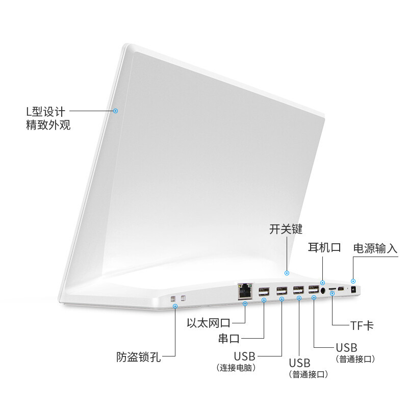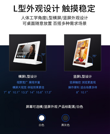 一、L型外觀設計,人體工程學角度,橫豎屏支持,可桌面隨意放置,觸摸穩(wěn)定;百搭各種需求場景